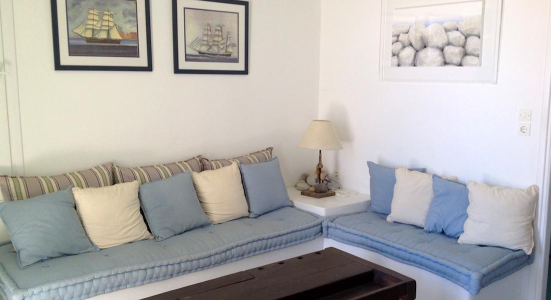 The simplicity of the traditional Cycladic architecture of the house is combined harmoniously with the stone walls and the carefully decorated decoration.