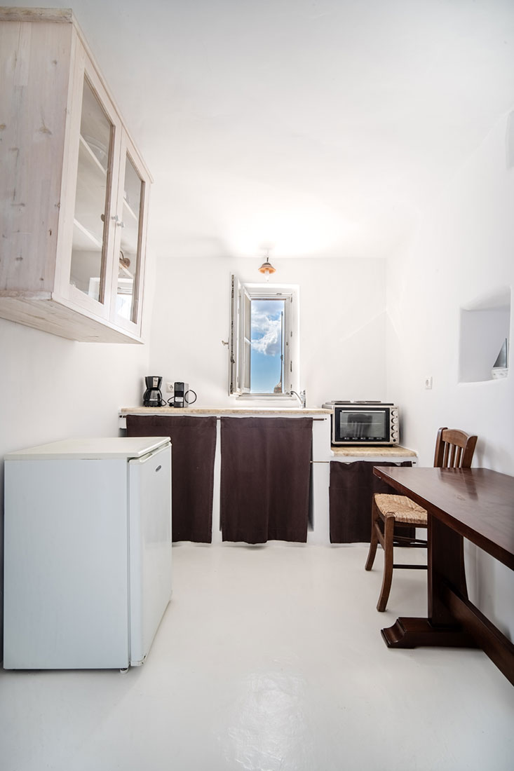 One bedroom with a double bed, one bathroom with shower, and one kitchen with dining space. The three areas are accessible through external doors, on a private veranda with the view.